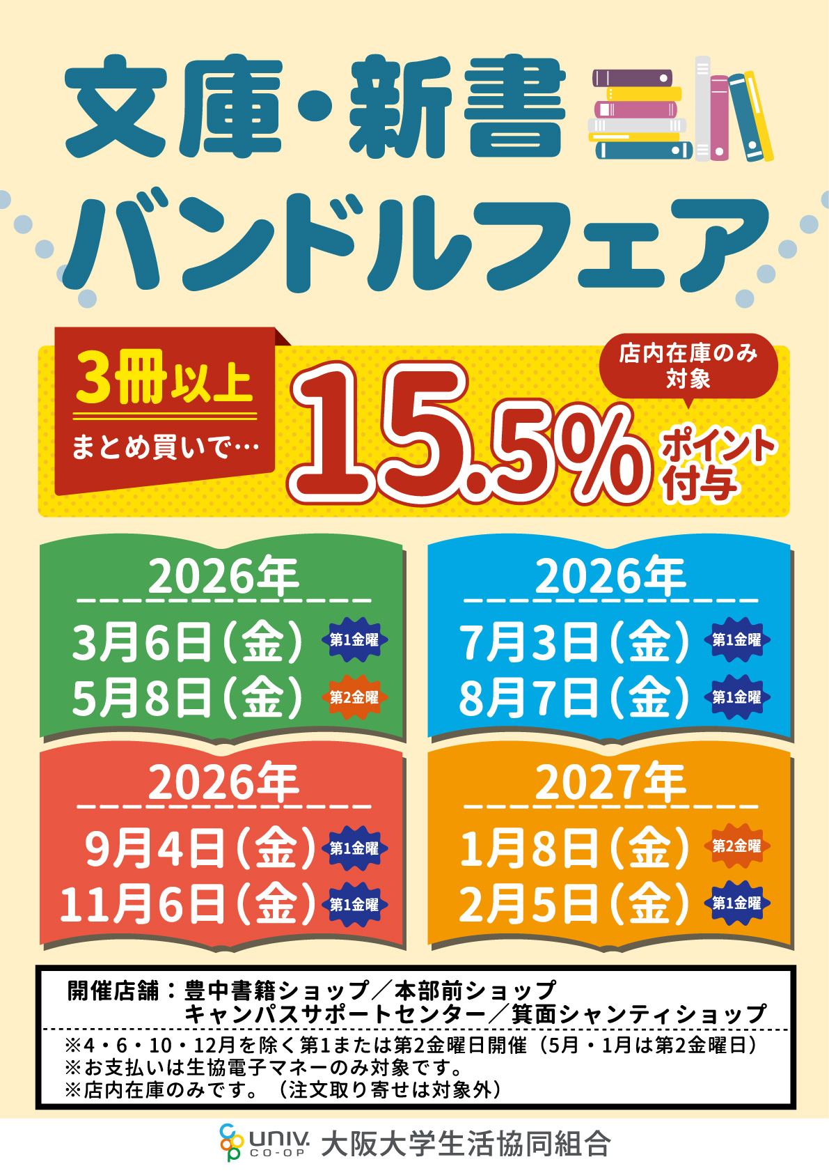 大学生協のPotal Site(書籍オンライン注文サイト)を御存知ですか?受け取り方法の選択画面で当生協を選んでいただくと最大10.5%ポイント付与でご購入いただけます。(組合員に限る)上のバナーからPotal Site(書籍オンライン注文サイト)を是非ご利用ください!文庫・新書まとめ買いバンドルフェア