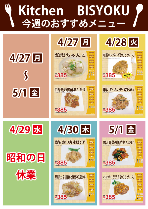 4/13~4/18 プラス1品。小鉢でビタミンやミネラル、食物繊維を補いましょう!