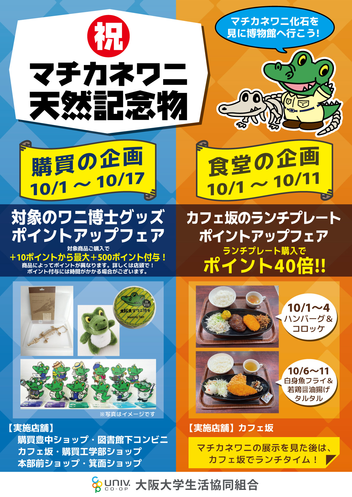 阪大生協ではお祝い企画として、「祝・マチカネワニ天然記念物企画」を実施いたします!