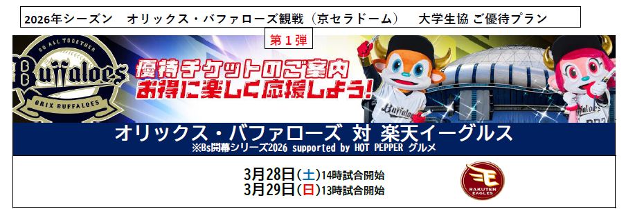 2026.03.26 2026年シーズン オリックス・バファローズ観戦 大学生協ご優待プラン第1弾!
