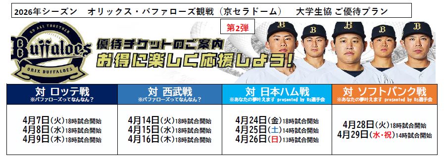 2026.03.26 2026年シーズン オリックス・バファローズ観戦 大学生協ご優待プラン第2弾!
