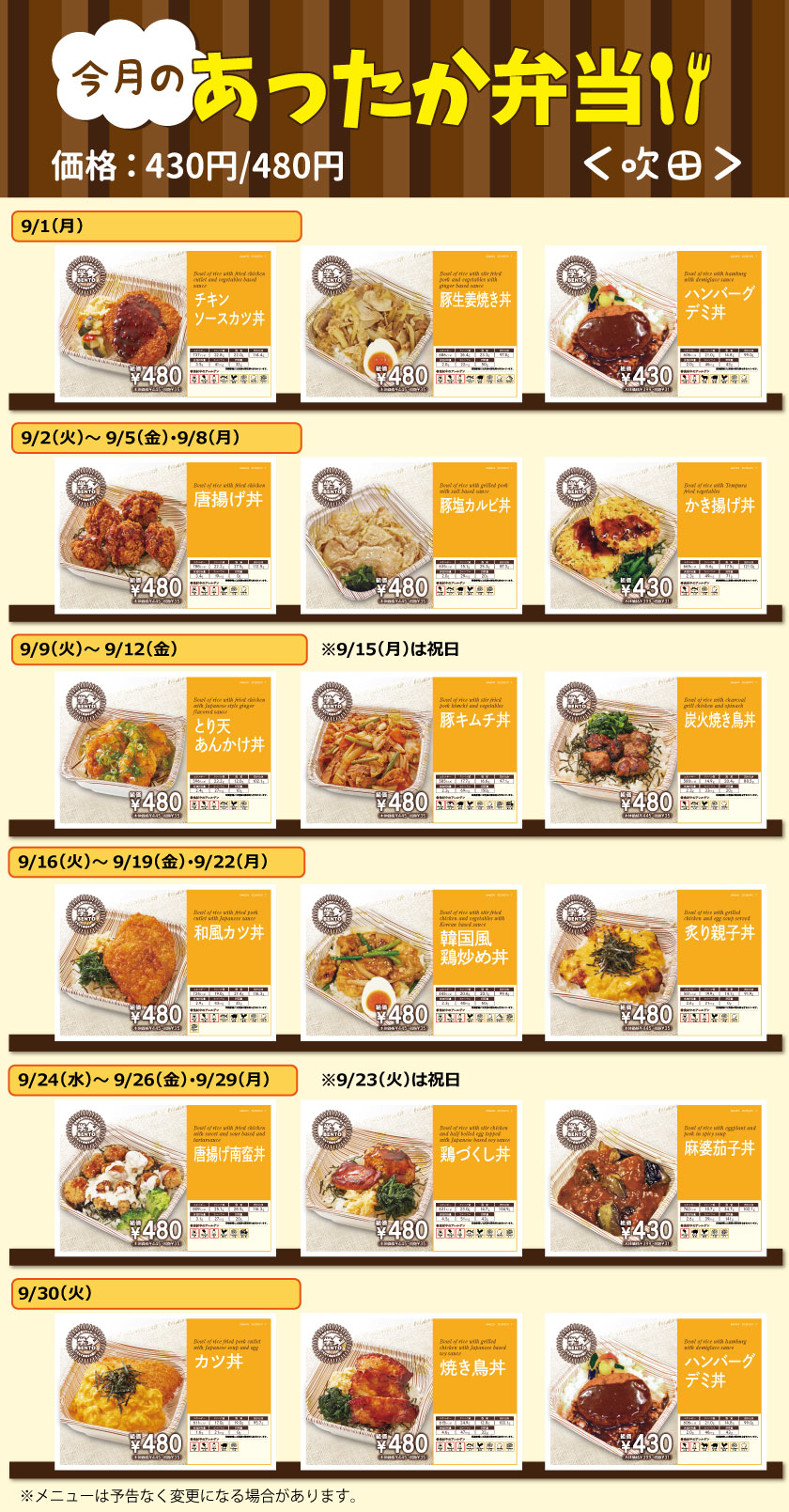 取扱店舗:「工学部購買店」「本部前店」「医学部mini shop」「歯学部店」「薬学部 弁当ショップ」あったか弁当カレンダー(430円/480円)