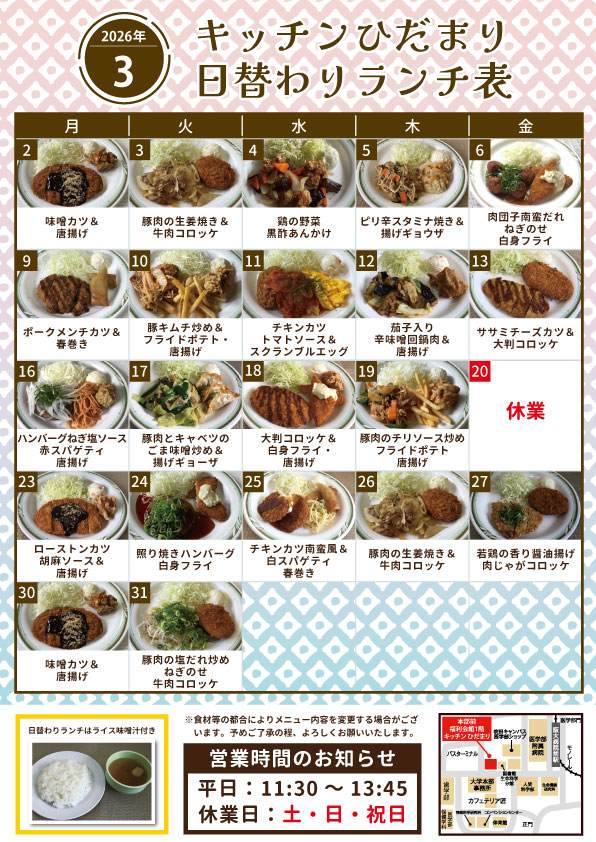 2・3月は休業本部前喫茶キッチンひだまりメニュー