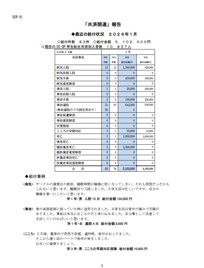 大阪大学生協の「CO・OP学生総合共済」の月別加入者件数と給付事例をご覧になれます。◎2026年