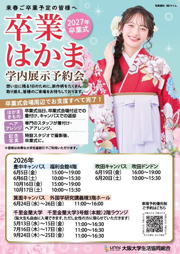生協リーフレット中面記載の豊中キャンパス展示会スケジュールに誤りがございました。正しいスケジュールは本ウェブサイト、リーフレット表紙にてご確認ください。