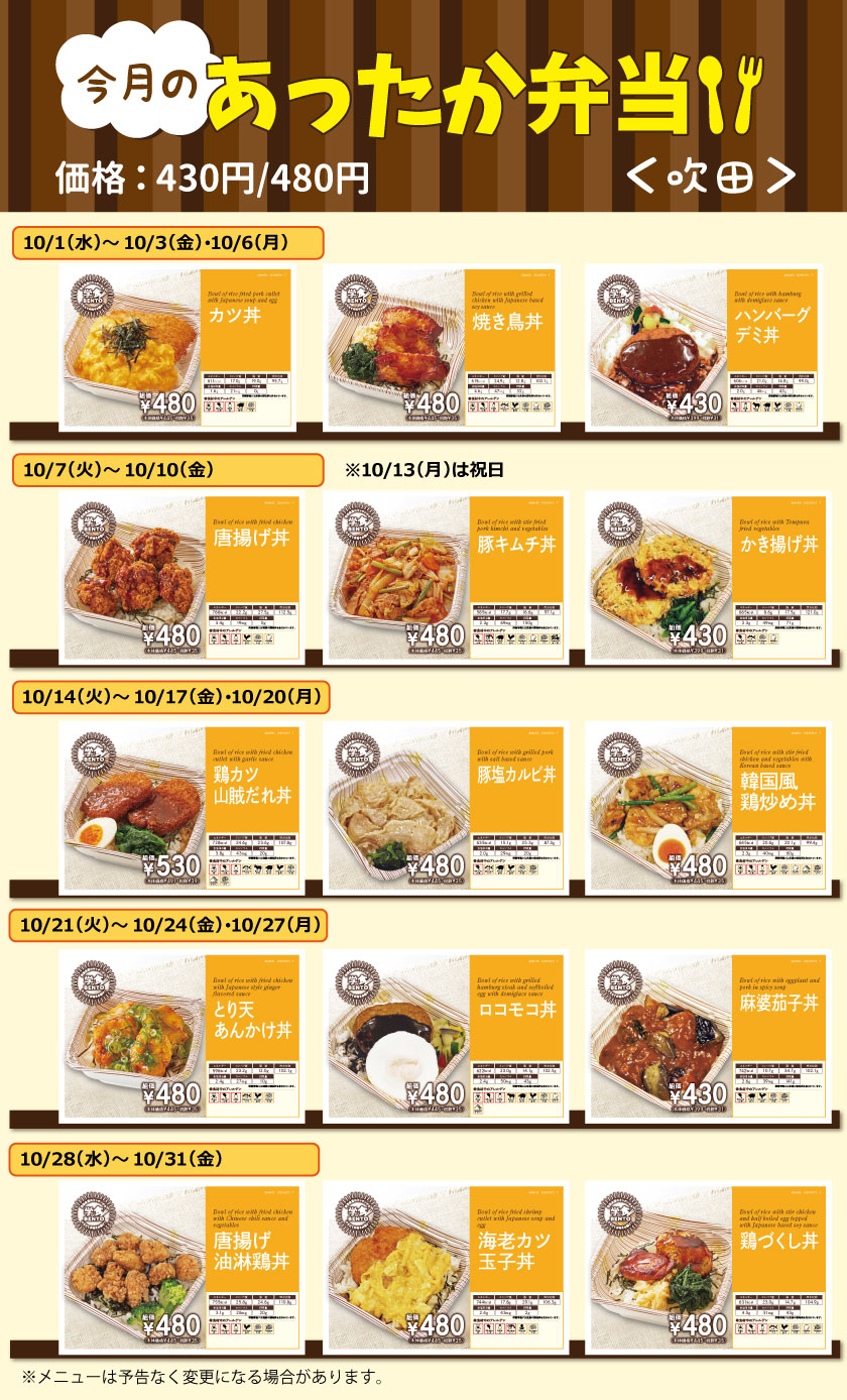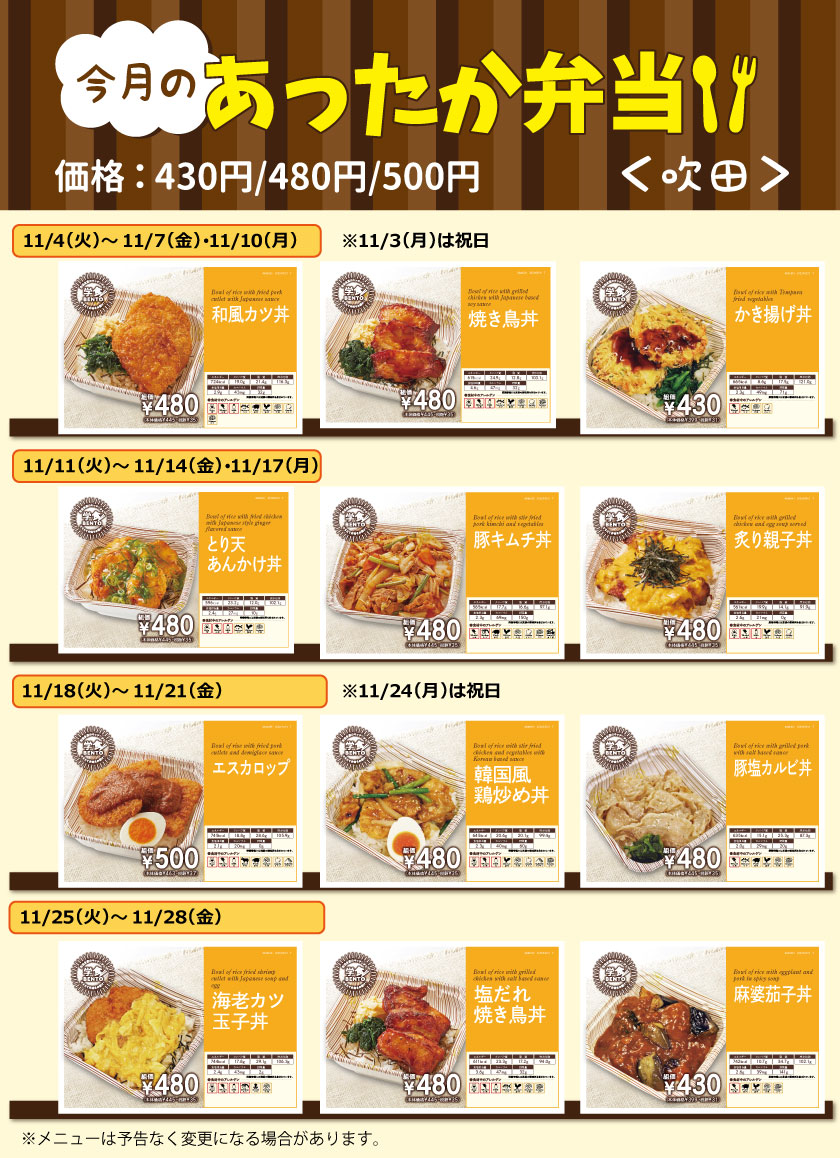 取扱店舗:「工学部購買店」「本部前店」「医学部mini shop」「歯学部店」「薬学部 弁当ショップ」あったか弁当カレンダー(430円/480円)