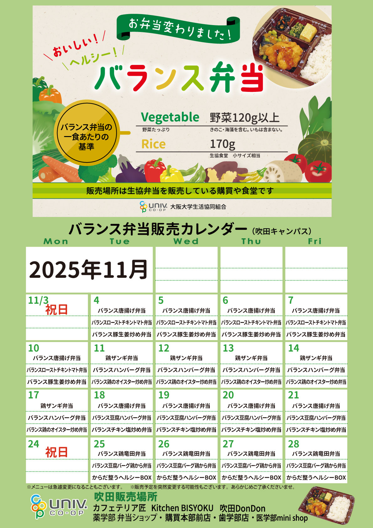 取扱店舗:「本部前購買店」「医学部mini shop」「歯学部店」「薬学部 弁当ショップ」「BISYOKU」「吹田DONDON」「カフェテリア匠」バランス弁当カレンダー(530円/590円)