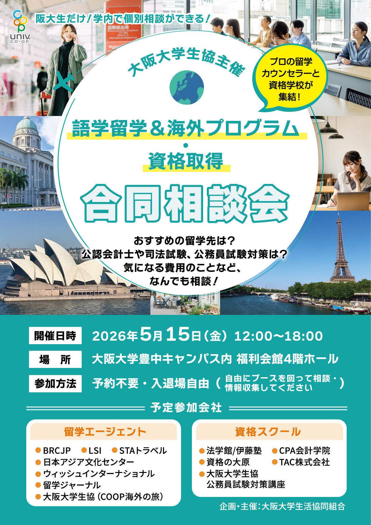 学内で生協提携の留学エージェントと個別相談ができます。エージェントの詳細はこちら--------横スライド(表)パーツを削除する際は、この一行上の空白行から[横スライド(表)終了]まで全てを選択し削除してください--------