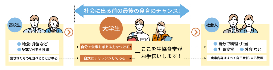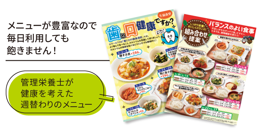 毎日食べる習慣が身につきます 食費を削らず生協食堂でバランスの良い食事ができます。予め食費が確保できるので、毎日食べる習慣が身につきます! |