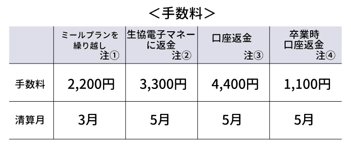 ミールプラン残高充当・返金制度 入学後の生活が分からなくても安心して購入いただけます! ミールプラン利用期間終了後ご利用金額がお支払い金額よりも少なかった場合、その差額から手数料を引いた金額を翌年度のミールプラン購入に充当、または生協電子マネーにて返金。もしくは口座振込みのいずれかの方法でお返しします。 ※それぞれ手数料がかかります。 |