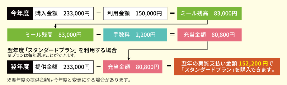 翌年度のプランを購入する時は、プランを変えることも可能。卒業時には、残っている残高は口座振り込みにてお返しします。