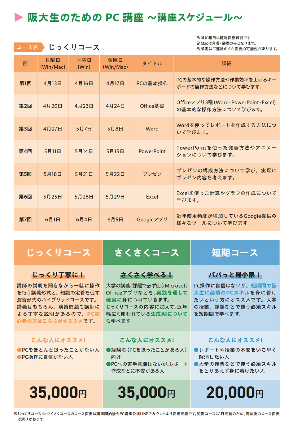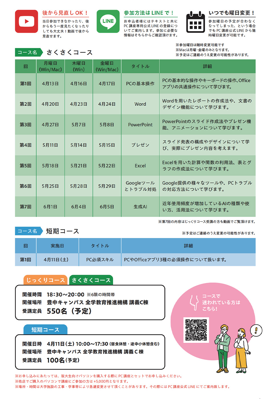 ※ じっくりコース ⇔ さくさくコースのコース変更は講座開始後もPC講座公式LINEアカウントより変更可能です。
