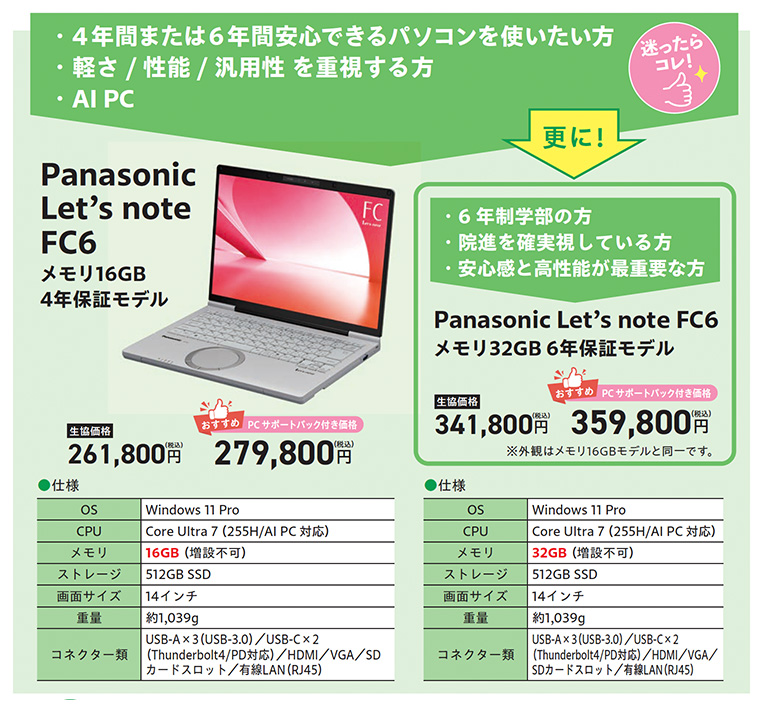 堅牢性と破損率を考えて、安心の Let's note を選びました。特に理系の方には Core Ultra7 を勧めたい。