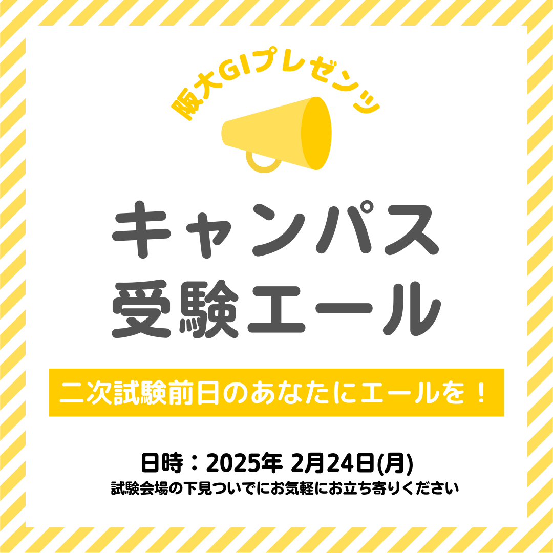 2/24(月)二次試験前日に、阪大GI主催キャンパス受験エールを開催します!絵馬(紙)に意気込みを書いたり、私たち学生委員会のメンバーからの応援メッセージが受け取れます。所要時間は5分程度からと短いので、お気軽な参加で大歓迎!予約不要の飛び入り参加型なので、ぜひ会場の下見ついでにご参加ください♪